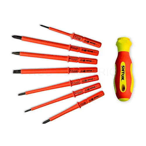 Набор диэлектрических отверток SHTOK 09345 7+1 со сменными вставками в кофре для профессионального использования.