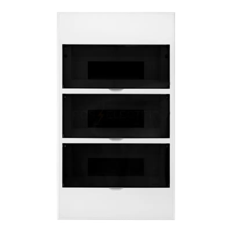 Бокс пластиковый ЩРВ-П IP41 предназначен для установки модульных устройств при распределении электроэнергии до 400 В в квартирах, офисах, жилых, муниципальных и технических помещениях. Корпус состоит из лицевой и несущей частей, выполненных из надежных и долговечных материалов: прозрачная дверца изготовлена из поликарбоната (позволяет видеть состояние автоматов без необходимости в открывании щитка), белая дверца – из ударопрочного ABS-пластика. Внутренняя часть корпуса с увеличенным пространством удобна для монтажа оборудования. Изделие выполнено в соответствии с нормами пожарной безопасности и изготовлено из материалов, которые не поддерживают горение. Современный дизайн позволяет устанавливать распределительный щиток в любое пространство. Внутри установлена стальная DIN-рейка для крепления на нее различных модульных устройств, в комплектацию также входит набор винтов для крепления. Произведено в Европе в соответствии со всеми стандартами безопасности (ГОСТ 14254 - 2015 и IEC 60529:2013). Технические характеристики: Количество рядов: 3Количество модулей: 36Вид установки: встраиваемыйМатериал корпуса: ABS-пластикЦвет дверцы: прозрачныйЦвет: белый RAL 9010Степень защиты: IP41Рабочая температура: –25...+85 °СРазмеры (ДхВхГ): 300х530х100 мм