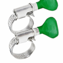 Хомут червячный с ключом — это соединительный элемент, применяемый для крепления и герметизации соединения шлангов, патрубков и других жёстких и гибких трубопроводов, ключ на данном хомуте позволяет обойтись без вспомогательного инструмента. Такой хомут несложно затянуть или раскрутить вручную, поэтому в быту этот крепеж находит применение обычно там, где его требуется часто снимать и ставить вновь. Область применения: предназначен для обжатия различных соединений в гидравлических и пневматических системах и должен обеспечивать герметичность соединений в условиях умеренного и тропического климата.