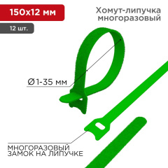Хомут–липучка многоразовый 150х12 мм, зеленый (упак. 12 шт.) REXANT 07-7153