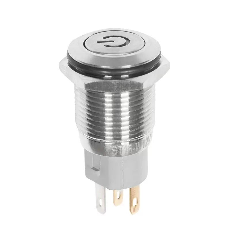 Кнопка антивандальная Ø16 12В Б/Фикс (5с) (ON)-OFF плоская подсв/синяя POWER предназначена для коммутации электрических цепей напряжением до 12В путем включения-выключения питающего провода. Металлические кнопки применяются в местах, где существует большой риск их повреждения (на различных производственных линиях, в лифтовых кабинах, около входной двери и т.д.), а также для декоративного оформления панелей управления. Главными отличительными особенностями такой кнопки являются металлическое исполнение и неуязвимость контактной группы, что обеспечит ей долговечное функционирование. Изделие состоит из двух основных частей - лицевой части (головки) и контактной, и имеет пружинный возвратный механизм. Монтаж осуществляется без применения винтов на плоских панелях толщиной от 0.5мм до 10мм. Подключение проводов осуществляется с помощью винтовых зажимов, пайки или разъемом.Основные характеристики:Номинальное напряжение: 12В;Номинальный ток: 3A (250VAC);Тип переключения: (ON)-OFF;Количество контактных групп: 1;Количество контактов в контактной группе: 3;Фиксация положений: отсутствует;Индикатор коммутационных положений: синий;Установочный диаметр: 16мм;Рабочая температура: от -25℃ до +55℃;Ресурс: 10 000 циклов.Преимуществами использования данного изделия является надежность, быстрота и удобство монтажа.