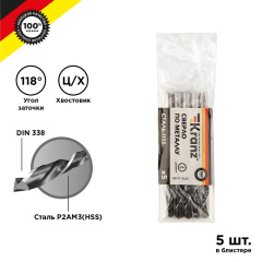 Сверло по металлу 8,0х117х75 мм HSS (5 шт. в упаковке) DIN 338 Kranz KR-91-0625