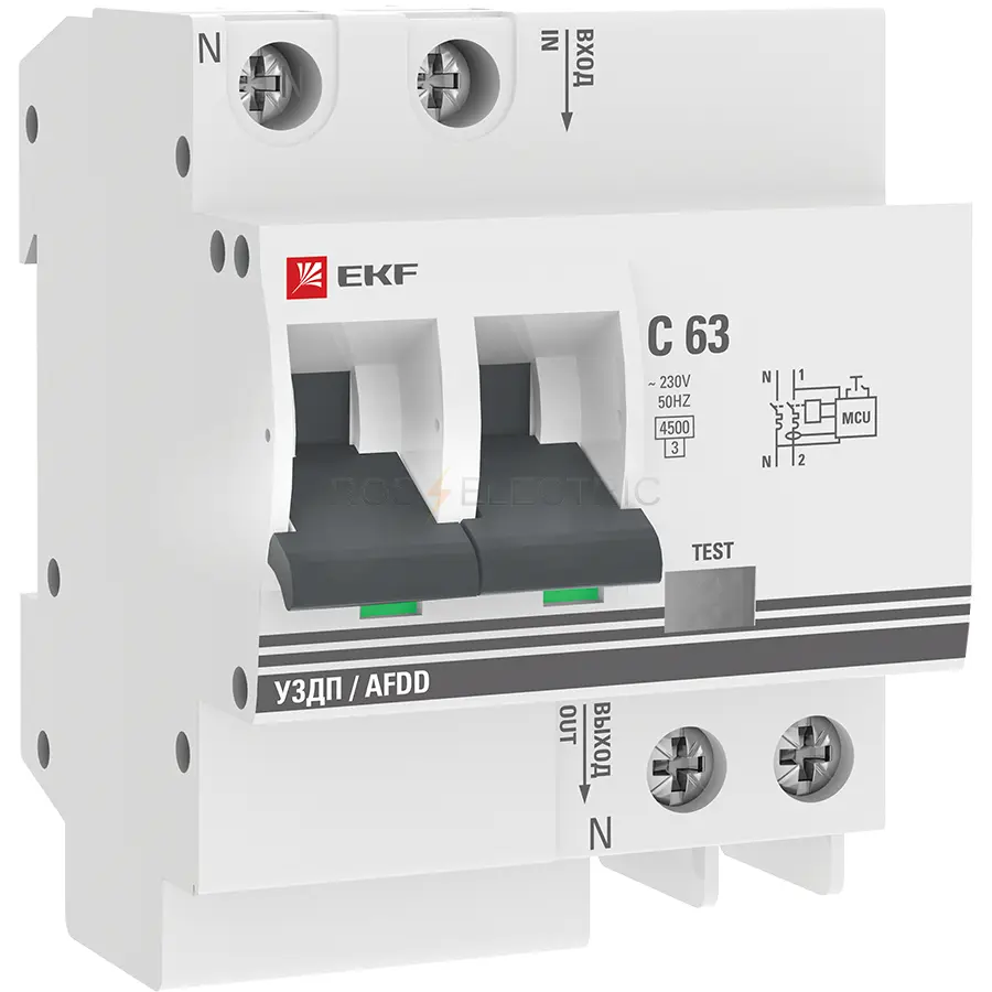 Устройство защиты от дугового пробоя (УЗДП) с автоматическим выключателем 2P 63А (C) 4,5кА 72 мм EKF afdd-2-63C-72-pro